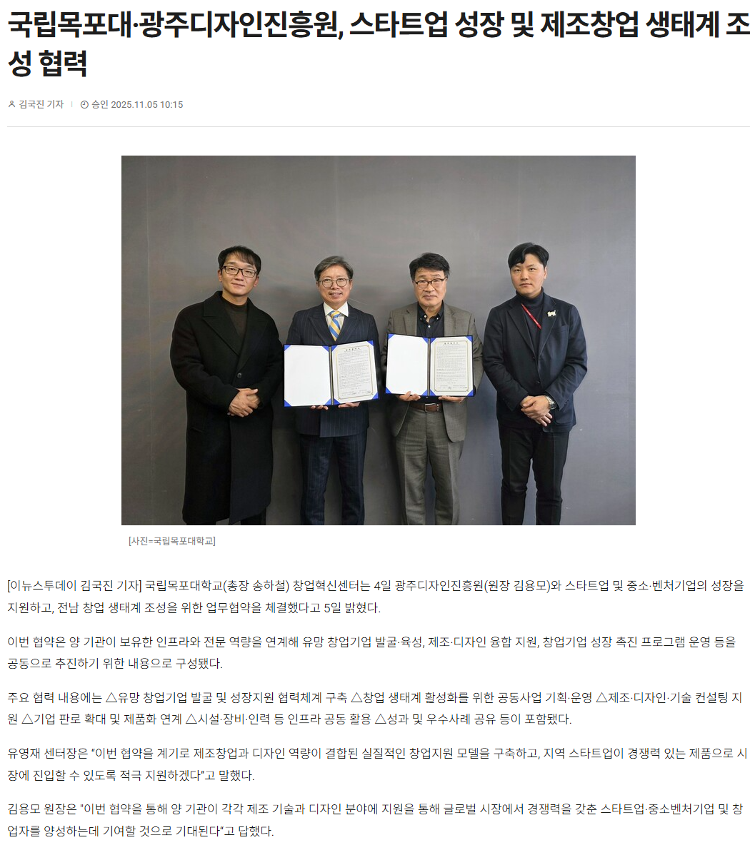 광주디자인진흥원·국립목포대, 스타트업 성장 및 제조창업 생태계 조성 협력-이뉴스투데이