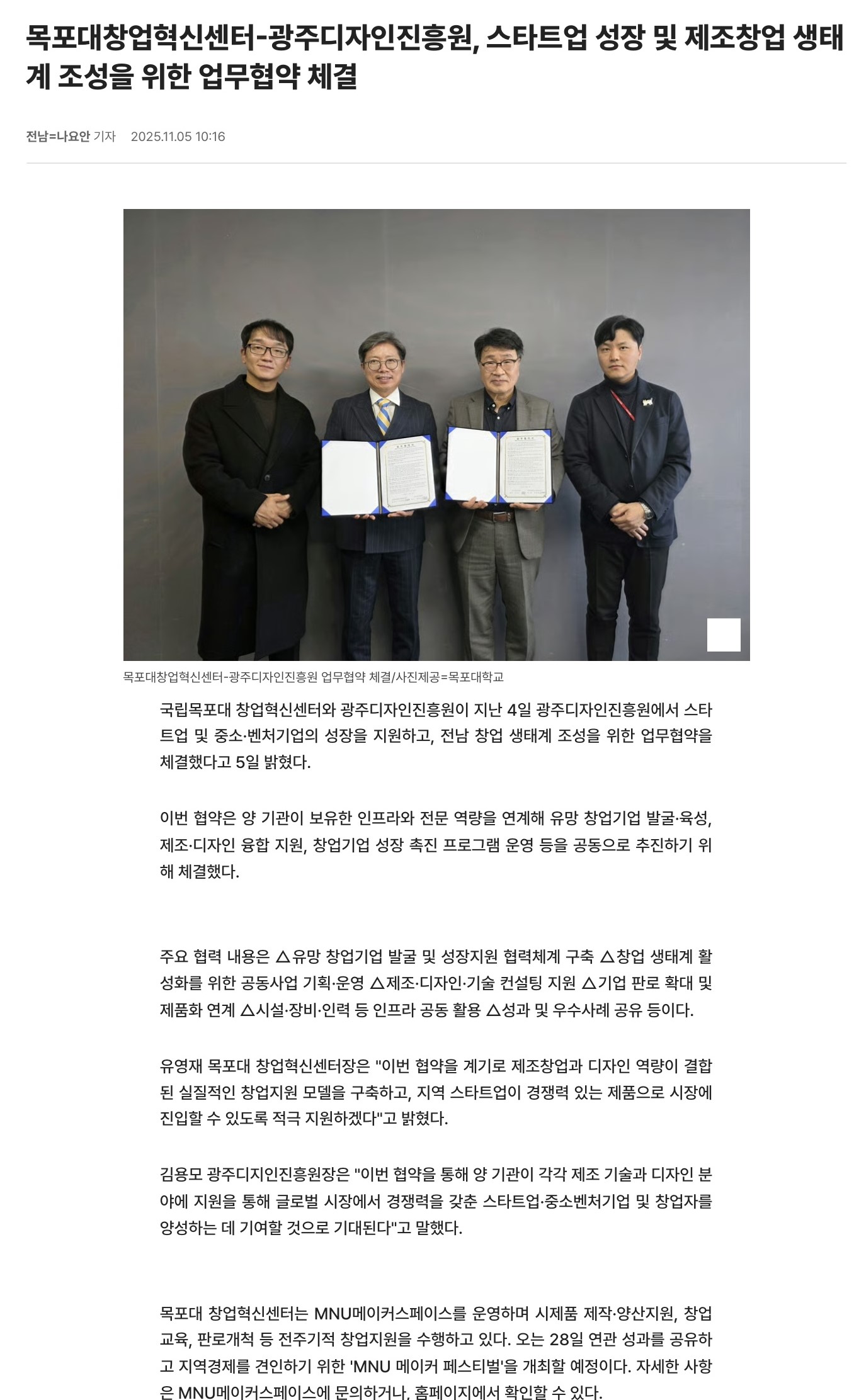 목포대창업혁신센터-광주디자인진흥원, 스타트업 성장 및 제조창업 생태계 조성을 위한 업무협약 체결-머니투데이