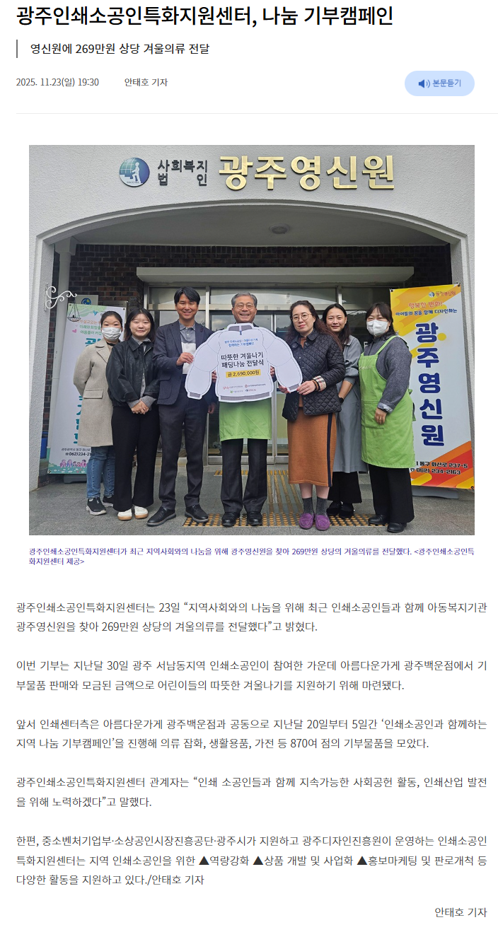 광주인쇄소공인특화지원센터, 나눔 기부캠페인-광주매일신문
