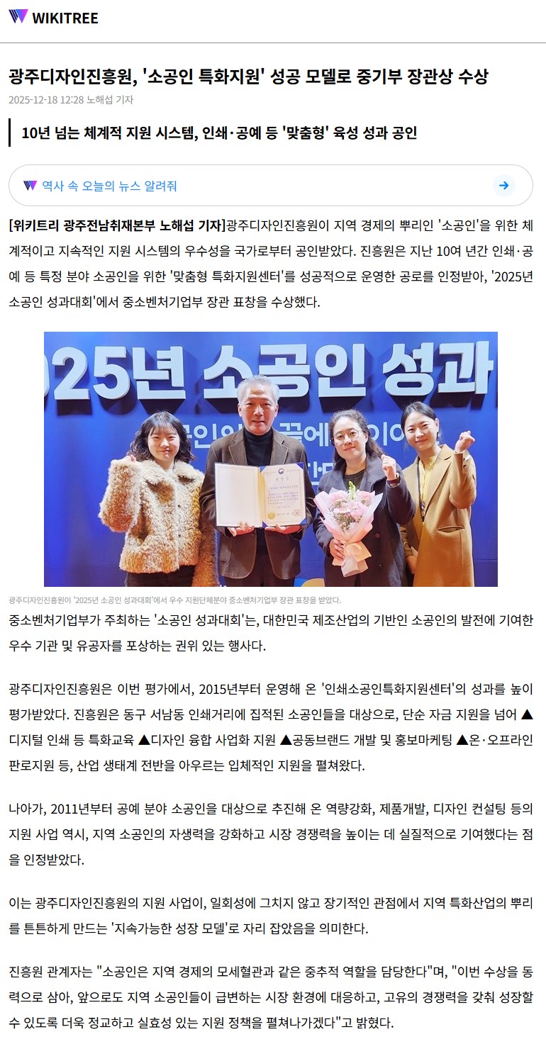 광주디자인진흥원, '소공인 특화지원' 성공 모델로 중기부 장관상 수상-위키트리