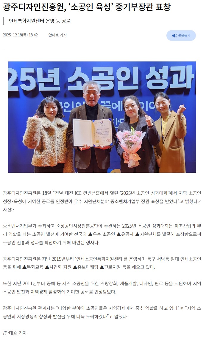 광주디자인진흥원, ‘소공인 육성’ 중기부장관 표창-광주매일신문