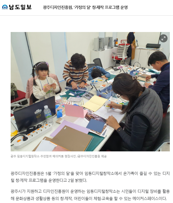 ※ 자세히 보기 광주디자인진흥원, ‘가정의 달’ 창·제작 프로그램 운영 < 경제 < 뉴스 < 기사본문 - 남도일보 (namdonews.com)